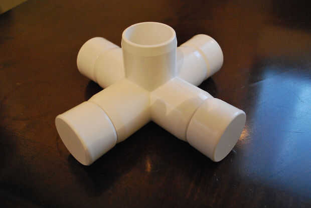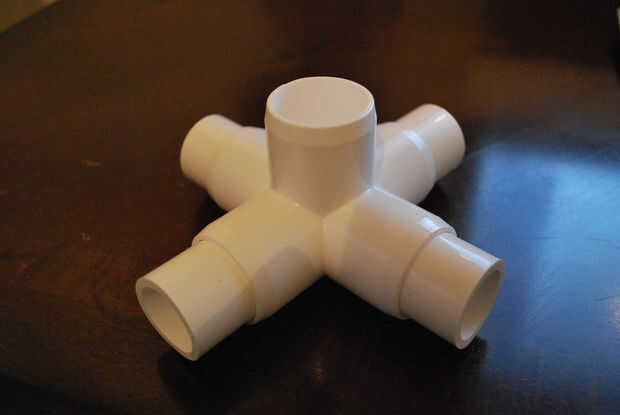 Utilizando cemento para PVC, introduzca los 4 cuatro 2" segmentos de tubo de PVC en los cuatro lado de la conexión de 5 vías de 1" y asegúrese de que están completamente en.