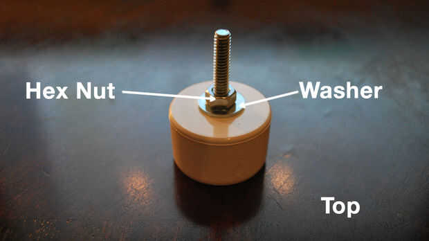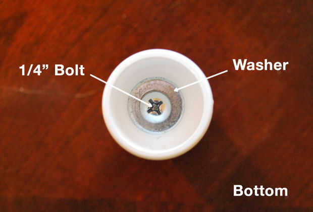 Después de su hacer su agujero, inserte una arandela en el perno de 1/4", luego inserte a través de la parte inferior de la tapa externa de PVC. Coloque otra arandela en la parte superior y luego enrosque y apriete 1/4" hexagonal audaz sobre la configuración del todo como se muestra en las fotos.