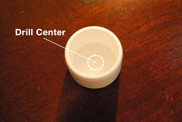 Aquí es donde se pone interesante:Si usa un casquillo externo grado de tuberías PVC, puede ser casi imposible, como se redondean. Podría montar en un torno, encontrar el centro de la tapa, perforar el orificio 1/8", luego siga hacia arriba con el 1/4" broca para acabarlo apagado, pero recomendamos usar un casquillo externo del grado de muebles de Formufit ya que son planas y al ras en la parte superior. Tienen un lugar en el centro exacto donde se puede saber el proceso de moldeo se produjo, que hace que sea fácil encontrar el centro.