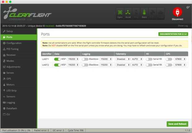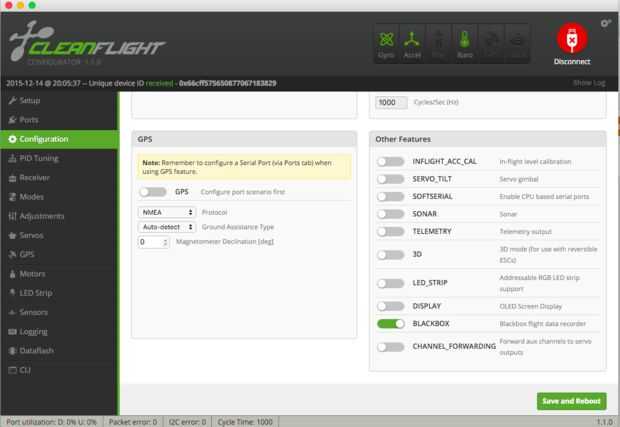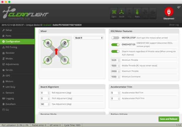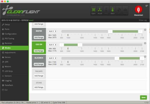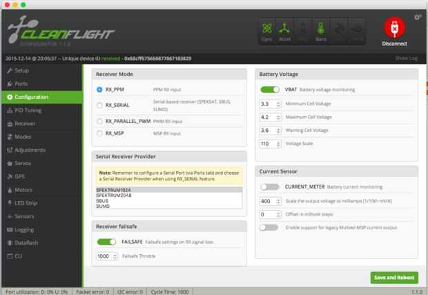 - Configuración: Activar ONESHOT125 (un protocolo de comunicación más rápido entre el NE y los CES). Configurar aceleración máxima a 200 y aceleración mínima para 2000. Cuando MOTOR_STOP está desactivado, sus motores comenzará a girar a velocidad mínima tan pronto como usted del brazo por lo que tendrá que disminuir si tu quad intenta levantar tan pronto como usted del brazo. Yo estoy Armando por un interruptor (canal AUX) por lo que también he seleccionado "Desactivar independientemente del valor de la aceleración". Ajuste del desvío se encuentra a 90 como he cambiado la orientación de la Naze32 a mi AP (puntos de la flecha debe apuntar hacia adelante a la derecha). RX_PPM es seleccionado como mi salida del receptor es PPM (modulación por posición impulsos, que me permite transmitir 8 canales en un cable de señal) en lugar de PWM (pulso modulación de anchura de que requiere un cable por el canal). También se habilitan VBAT y a prueba de fallos. Mariposa a prueba de fallos se encuentra a 1000 para el quad bajará del cielo, si se pierde la señal (importante: también tienes failsafe en el receptor para el FC sabe cuando se pierde la señal. Leer manual de instrucciones y documentos de Cleanflight el receptor). Registro de datos de Blackbox está habilitado como la rev.6 de Naze32 viene con memoria flash integrada de 2MB.