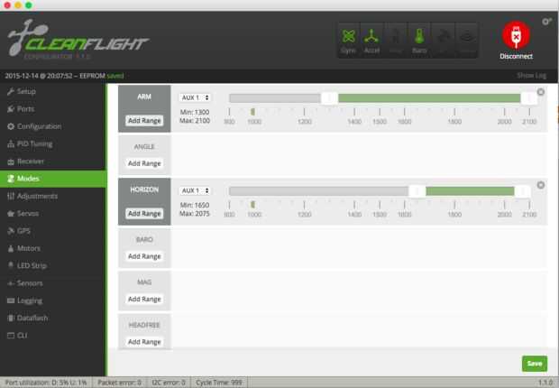 - Modos: estoy usando un interruptor de 3 posiciones en mi radio para modos de armado y vuelo. Se desarma la posición superior, el medio es el modo de acro (sin estabilización) y la parte inferior es horizonte (auto nivelación pero puede hacer flips y rollos en los límites de cada palo). Esto me permite desarmar fácilmente o cambiar al horizonte si asuste. La alarma se establece a un switch diferente (para encontrar el quad si derribado). Otro interruptor se utiliza para habilitar el registro de blackbox y un final uno se utiliza para desactivar el OSD si quiero.