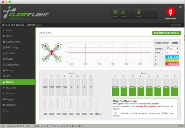 - Motores: Esto es muy importante. Tendrá que calibrar sus CES de esta ficha. Para ello, primero hacen que los apoyos se quitan! Encender la naze32 por USB, conectar, compruebe el interruptor en esta ficha y mueva el regulador principal al completo. Encienda el quadcopter con la batería. Debe oír una secuencia de pitidos que significa que el CES han reconocido el acelerador a fondo. A continuación, mueva el control deslizante al mínimo. Usted debe oír otra secuencia de pitidos. Energía y otra vez y comprobar que los motores todo marcha al mismo tiempo y hacer girar para arriba muy bien (esto se puede ajustar en BLHeliSuite si es necesario). Ahora regresa a la pestaña de configuración y establece el mínimo de la válvula reguladora en el valor más bajo que los motores girando a confiablemente (debe ver este valor en la ficha de motores en el regulador principal). Mina fue 1025.