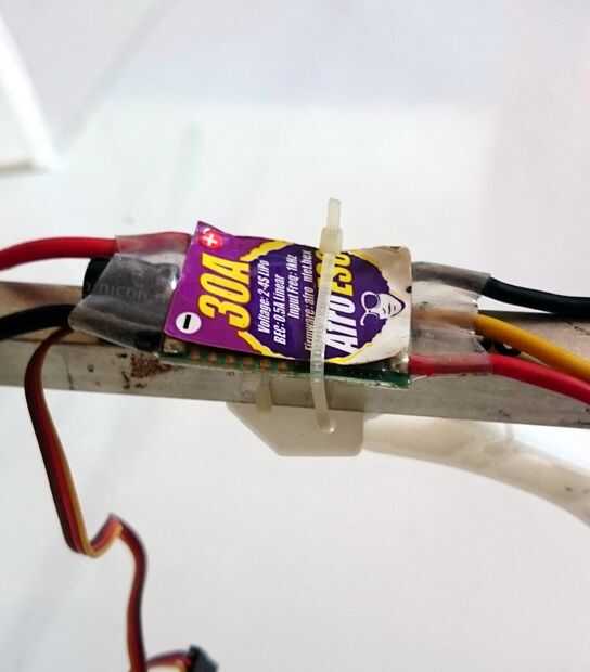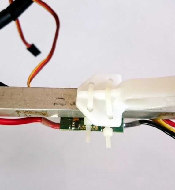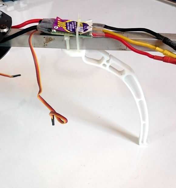 Colocar el tren de aterrizaje en la parte inferior del brazo 50mm del extremo de la placa y recorren una sujeción de cable de los 2 orificios, traer sobre el brazo y fije la. El segundo cable de lazo a través de los otros 2 agujeros, poner sobre el brazo, coloque la ESC en el brazo y fije la. De esta manera la salida es fija al brazo.