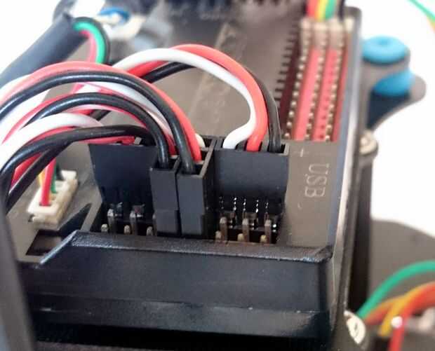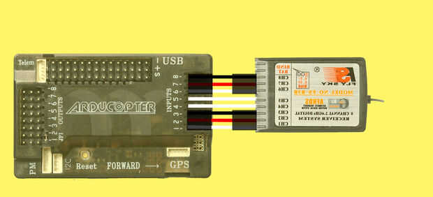 Utilizar cuatro cables de servo de 3 pines para conectar el lado de la señal del módulo de receptor para el lado de la señal de la Junta Directiva de la APM. El módulo receptor es alimentado a través de la Junta Directiva de la APM, así que asegúrese de al menos 1 de los conectores de 3 pines se conecta horizontalmente a través de todas las 3 columnas.