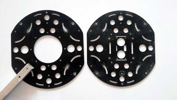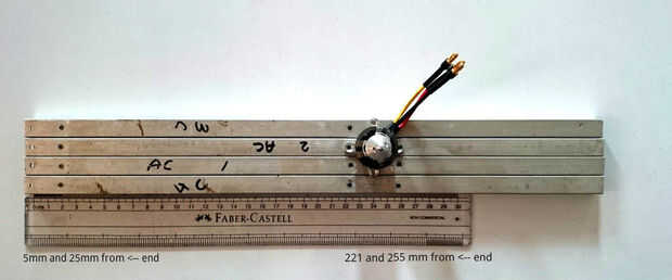 Por lo tanto, de un extremo perforé cuatro orificios de 3.5mm con centro de 5mm, 25mm, 221mm y 255mm. Los 2 primeros orificios sirven para conectar el brazo a la placa base. Los últimos 2 agujeros sirven para conectar el motor. Ajustar la distancia entre los 2 primeros orificios según la distancia entre los orificios de la placa central.