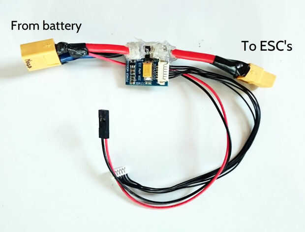 El kit de APM 2.6 tiene un módulo de potencia que monitorear el voltaje de la batería durante el vuelo. También tiene un BEC incorporado que las energías de la placa principal. El extremo de la entrada a la batería y el extremo de salida va a la ESC.