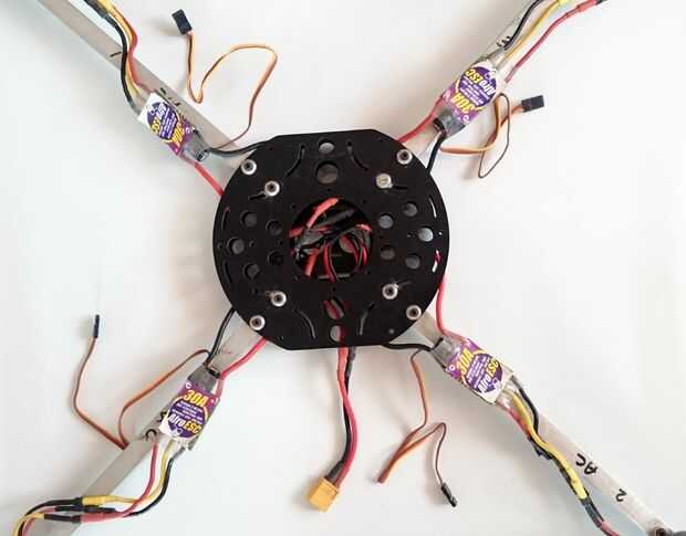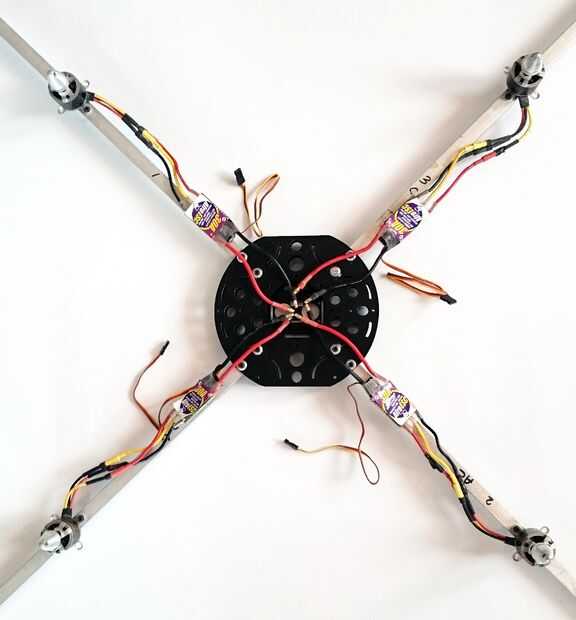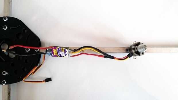 Lugar la ESC en el brazo. Conecte el lado de salida de salida al motor. Aquí no importa la polaridad. El motor simplemente se gira en sentido contrario, si se cambian las 2 patas.