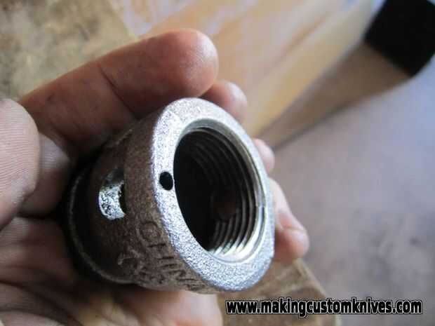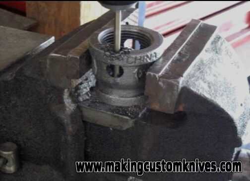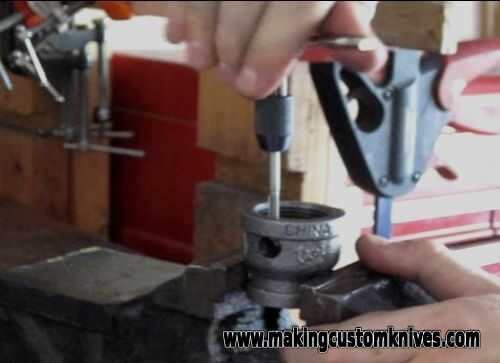 El agujero es fácil de perforar a mano, solo prestar atención al ángulo que son perforación a través de la pared del reductor. Es un ligero ángulo hacia adentro hacia la abertura más pequeña del reductor. Usé un tamaño 8/32 tap/tornillo se perfora con una broca de 9/64″. Usted puede ir más pequeño que esto si quieres, pero sugiero que no ir todo más grande, ya que sería más fácil de cortar a través de la pared del reductor.