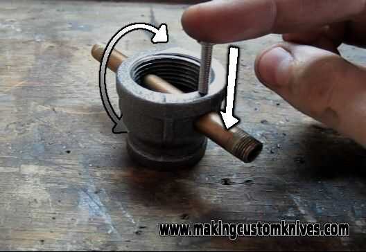 Ahora que el tubo de gas se ajusta a través de la ingesta de la hornilla, necesitamos encontrar una manera de fijarla en posición. Durante el uso, el orificio debe estar apuntando directamente hacia el tubo del quemador para quemar correctamente. Para ello, vamos a instalar un tornillo de ajuste para mantener el tubo de rotación.