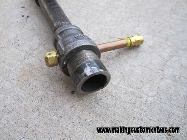 En la sección voy a hablar sobre soluciones para ciertas partes de este quemador de fragua. El primero es el tornillo de ajuste. Si no tienen un grifo conjunto, necesita utilizar otro método para asegurar el tubo de gas. Para sustituir el tornillo de fijación, se puede utilizar el extremo roscado de un tubo de 1 pulgada a la ingesta (reductor de campana). Simplemente apretar el tubo de 1 pulgada sobre el tubo para mantenerlo en su lugar. La desventaja a esto es que se reduce la ingesta y por lo tanto disminuye la cantidad de aire en la mezcla de combustible. Este inst necesariamente algo malo, sólo algo para recordar.
