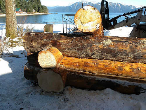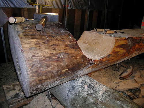 Rodar el registro. Con una motosierra y un socio para ver el otro lado, corte una serie de cortes paralelos a la profundidad marcada por la herramienta de trazado. Usar un hacha o adz para remover el material y luego cinceles o la motosierra para limpiar el corte. Rodillo en su lugar otra vez y comprobarlo. Marcar las zonas a cortar si es necesario.