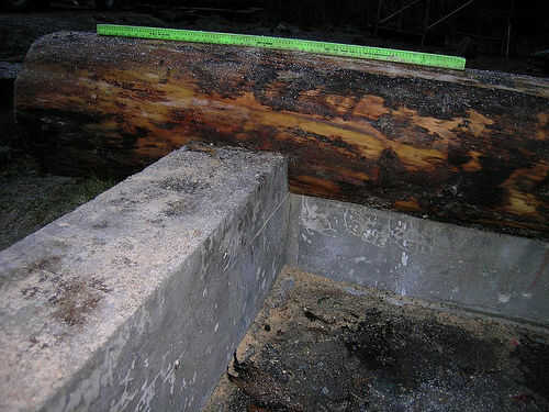 El primer curso de registros fueron cepilladas a nivel en el nivel más bajo de condiciones concretas. Una muesca se redujo a silla de montar la segunda grada de concreto. Tener una cadena recién afilada y una motosierra estadístico adecuado ayudará mucho con la molienda.