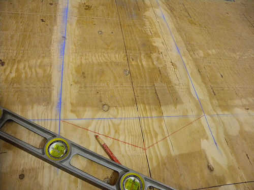 Marcamos una línea de centro para el registro de empate y centro para el puesto de rey. También marcamos donde la viga fue intersectar la viga de amarre, así como el punto donde la viga proyecto para conectar con la otra viga en la parte superior.
