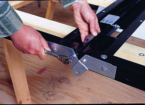 Alinear ambos marcos en dos tramos de 2 x 4 stock que abarcan un par de caballetes. Luego, montar las bisagras offset a cada lado del frente y atrás marcos (Foto 5). Por ahora, no apriete los sujetadores.
