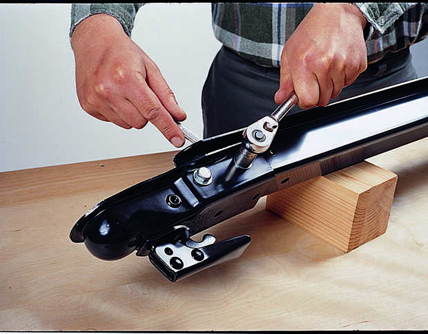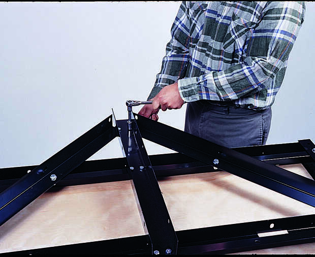 El trailer está hecho de dos bastidores de escalera similares junto con las placas de bisagra que permiten el montaje a doble. Tras los planes en el manual, montar ambos marcos boca abajo con los pernos, arandelas y tuercas (Foto 3). Los travesaños de los bastidores son en forma de U con pestañas hacia arriba (los marcos están boca abajo), y tienen dos orificios para los tornillos en cada extremo. Sólo Instale los pernos en ambos orificios de la final del remolque delantero y posteriores travesaños. En los otros cuatro travesaños, dejar los pernos por los orificios de la brida por ahora. Cuando los marcos juntos, agregar el canal de la lengua y las dos diagonales (foto 4). Los extremos de los tirantes se empernan a través de los agujeros abiertos en la brida intermedia del marco frontal.