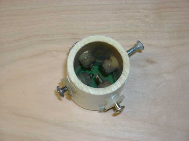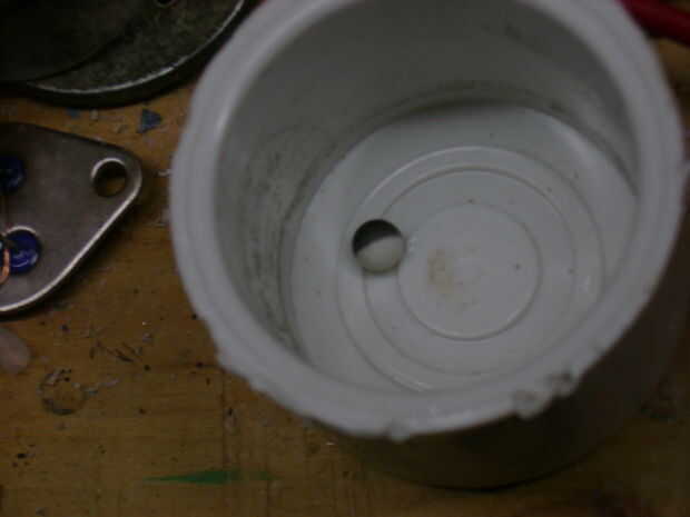 Otra configuración que probamos estaba usando un trigatron para iniciar la descarga de plasma. Básicamente hemos construido una pequeña cámara con 3 electrodos. 2 fueron conectados directamente con el Banco de capacitores. la 3ª fue conectado a la salida 20 de kv de un transformador flyback. La tierra del transformador estaba conectada al electrodo negativo del condensador. Los terminales se colocan lo suficientemente juntos para que el arco de alto voltaje reduce la resistencia suficiente para los condensadores de descarga. La cuestión clave con esta configuración es que los electrodos ablación bastante rápidamente y deben ser ajustados cada pocos disparos. También esta configuración funciona mejor con un banco de capacitores de 500v en alrededor de 500 joules. El Plasma generado realmente sears la parte posterior de la bb convirtiéndose un negro oscuro.