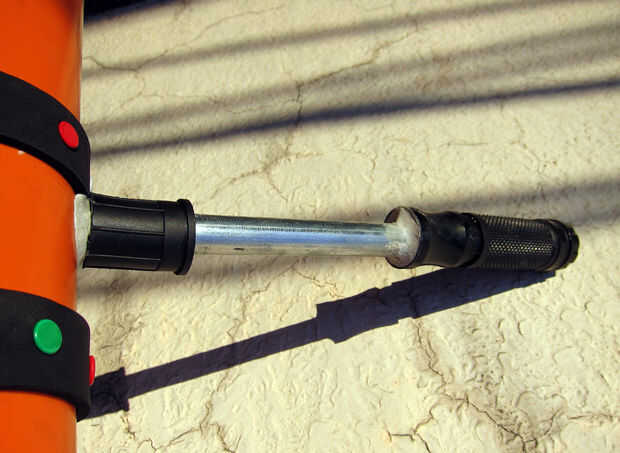 El Monopod está hecho de un segmento de 13 pulgadas de tubo de aluminio de 0.75 pulgadas con piezas de corte hacia abajo de dos manijas de bicicleta.