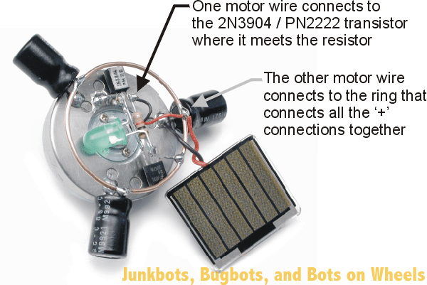 Ahora es el momento para cablear todo! Primero apagado conectaremos el cable derecho de transistor 3906 al ring. ahora los cables positivos de todos los condensadores y soldarlos al ring. A continuación, conectamos uno de los cables del motor (no importa cuál) el transistor derecho conducen en el transistor 3904 (del cable que está conectada la resistencia del transistor 3904), y el otro cable motor irá al ring. Ahora es el turno de las células solares. ahora conseguir el cable positivo de la célula solar (no mezclar la pos. y NEG.) y la soldadura al ring. Ahora el cable de la célula solar de NEG se consigue soldado al cuerpo del motor (la parte rayada)