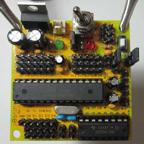 Mi batería de cajas de vinieron con soldadura de zapatas, así que tuve que conseguir 2 pares de cables rojo y negro, cortarlos unos 3" de largo, luego soldar cada par a la caja de una batería, rojo para el positivo, negro para el negativo. Toma el otro extremo del cable rojo de una caja y el cable negro de la otra caja y soldarlos juntos, de esta manera conectar las cajas en serie. Utilizar un pequeño tubo eléctrico de cinta adhesiva o retráctil para aislarlo. Los pines Molex en el resto de los conductores de la encrespadura y enchufe en la caja, con el cable rojo donde señala la flecha. Verificar la polaridad y el voltaje con un multímetro antes de enchufar el conector en el controlador de uBotino! Debe tener 6V (con pilas) y el positivo en el orificio marcado con una flecha.