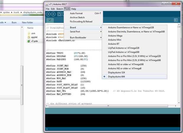 Establecer el tipo de Junta: Herramientas -> Tabla -> 644 DisplayDuino