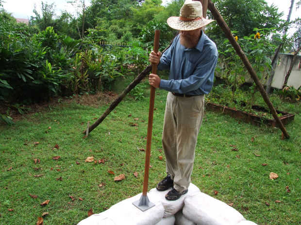 TAMP earthbags sólido y nivelado después de completar cada curso. Apisonar los altos puntos en primer lugar. Entonces uniformemente tamp toda la pared varias veces mientras mueves continuamente el tamper. Este último paso evita la creación de puntos bajos. Y si use el mismo número de cubos de tierra en cada bolsa y tiene cuidado de colocar las bolsas, los cursos son casi Self-leveling. Consistencia es la clave. Utilice el mismo proceso para cada bolsa. Recuerde colocar dos hilos de alambre de púas de 4 puntos entre cada curso.