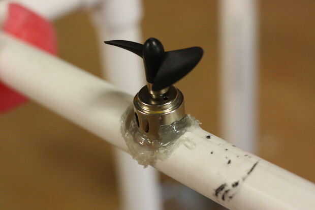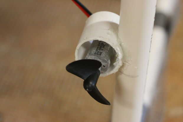 a continuación, agregue los motores a ella. Usé dos mini super cub avión rc motores para la propulsión y motor de shack de 1 radio para arriba y abajo del movimiento. Todos los motores son motores de 3 voltios. En primer lugar, mida la mitad de cada una de las secciones de 12 pulgadas en la parte posterior de la misma. Luego, tomar su Dremel y cortar pequeñas 1 y 1/2 largos tramos en algunos PVC. A continuación, forma una parte curva que se fijan a la estructura. Utilice pegamento caliente para fijar al marco, luego pegamento caliente horizontal motores para ellos. (Hacer esto al otro motor en el otro lado) Utilizar la Dremel para cortar una pequeña sección en la barra vertical superior del motor para que ajuste en el motor. Entonces, perfore un orificio en el extremo de la tubería. alimentar el motor en el orificio de la Dremel, entonces el cable a través de la tubería y el agujero del cable de alimentación. (No sello el agujero porque quiere agua para ser capaces de llegar y en. Caliente pegar el motor, luego fije todos los propulsores a los motores. Asegúrese de que los motores pueden funcionar libremente sin algo vinculante con el eje.