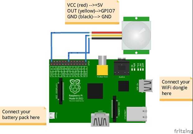 Se puede ver la conexión en el diagrama de abajo, los cables están conectados directamente a los pines GPIO del Raspberry Pi. Si necesita más información sobre pins GPIO pueden visitar a esta guía de makezine.com; es una buena fuente para familiarizarse con los pernos de la Raspberry Pi.