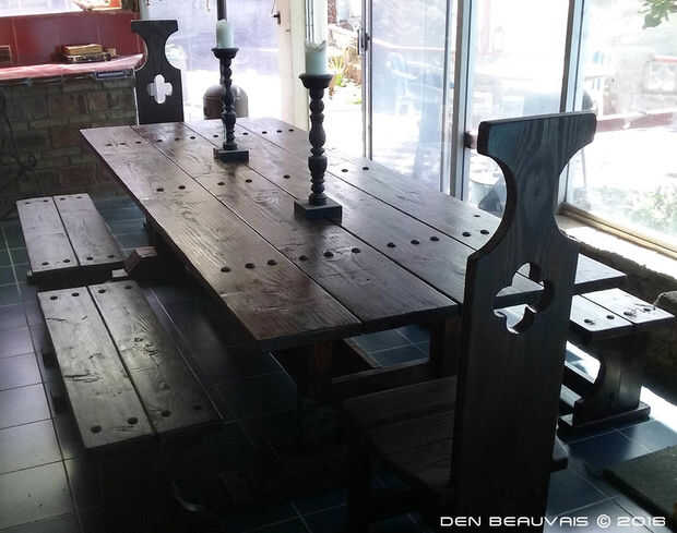 esta tabla fue diseño para caber en un pequeño espacio – mi loft de 500 pies cuadrados. Estaba buscando una luz que busca la tabla que puede alojar hasta 6 personas. Como hago a menudo, utilicé materiales reciclados para construir esta juego de comed