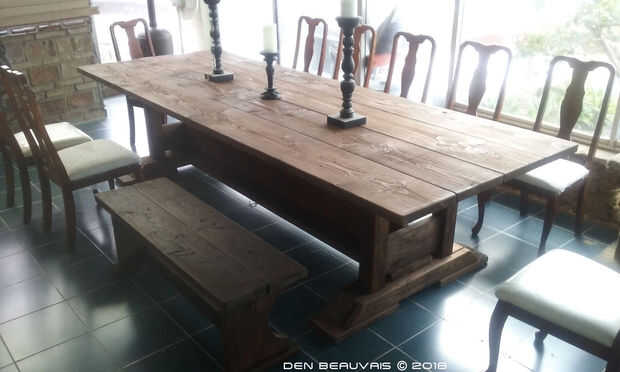 Ayuda adicional del músculo sería bueno montar las piezas de tabla y base de tirantes. Por desgracia estaba solo en el momento de poner todo junto y que no era tan fácil. Pero logré usando mi espalda mientras de rodillas y levantó la tapa de tabla como me deslicé en las piernas y cruzar los tirantes. en lugar de tornillos finales. Mejor para tornillo en la base "T" brace junto de debajo antes de que se enclavija con las piernas para la fuerza más horizontal para que el soporte inferior no sag. La rodillera T está diseñada para dar a la tabla más estabilidad y también puede utilizarse como un resto del pie. También se recomienda utilizar pegamento aquí antes de atornillar para más fuerza. Lamentablemente me olvidé de la rodillera T pegan y me temo que con el tiempo que el tablero inferior puede tirar lejos de sus tornillos. Pero por otra quizás no. Después de montar la tabla he creado un banco de prueba y todo salió bien así que hice los otros 3. Los bancos son bastante sencillos de montar. Comencé con los pedazos de extremo a sus bases de pie de montaje y luego convirtieron para arriba-lado-abajo al tornillo en el soporte transversal, por lo que sería un nivel como soporte para las tarjetas de Banco superior. Dale la vuelta otra vez y atornille la abrazadera inferior descansa sobre las bases de pie. Otra vez colocar estratégicamente sus tornillos sabiendo que serán cubiertos con clavos visibles. En la mayoría de los casos utilicé tornillos de madera de 3" y 6" para atornillar 4 "x 4" s o va por el lado de 2 "x 4" s como asegurar las patas a los soportes de la mesa. Puede utilizar tornillos de 2" o 2.5" pequeños en superficie tableros como el Banco superior o asiento mejores tablas. No es necesario como las piernas o de las bases será lo suficientemente robustos.