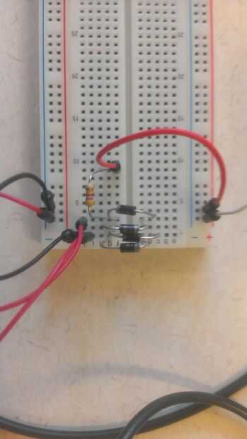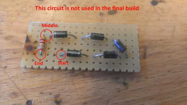 Porque el circuito es menos complicado que el circuito principal, debería ser más fácil de construir. Todavía puede ser útil construir en un protoboard primero para encontrar el diseño más compacto o eficiente. Una forma sencilla de soldar los diodos y el resistor debe colocar todo al lado de cada uno y les de la soldadura en un patrón de zig-zag. Para aclarar el cableado marca los tres lugares la necesidad de conexiones a realizar. Estas son el inicio de la cadena de diodos (Inicio), entre el último diodo y la resistencia (medio) y en el otro lado de la resistencia (extremo). Al igual que el circuito anterior, cortó los cables de exceso y asegúrese de que todo se suelda correctamente.