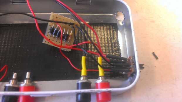 Más tensión se traduce en una salida más precisa, sin embargo el IC1 sólo puede manejar hasta 16 voltios. La mejor manera de hacerlo es mediante el uso de dos baterías de 9 voltios. Estas salida 18 voltios cuando se pone en serie, esto debe ser bajado mediante el uso de un circuito que consiste en unos pequeños diodos y una resistencia de 4700 ohmios. Los diodos bajan el voltaje por cerca de 2 voltios (dependiendo de cuántos se utilizan) y la resistencia es para evitar cortocircuitos.