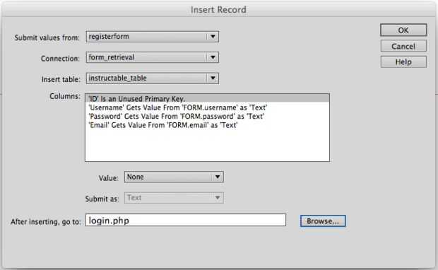 En la página de registro, agregue que un conjunto de registros como se hizo anteriormente. Esta vez, después de que golpeó "Recordset", un montón de cajas parpadeará en la pantalla, y entonces ya está conectado.