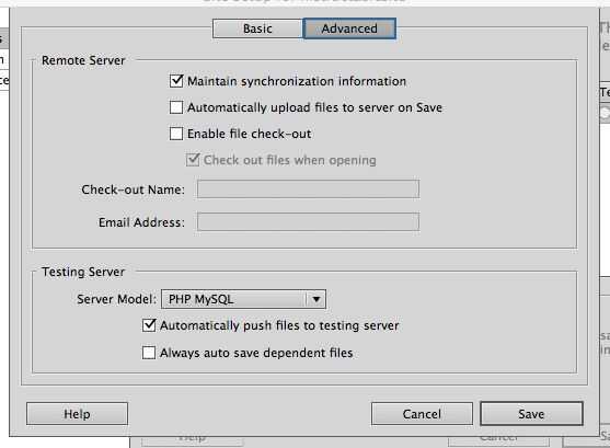 En Dreamweaver, cree un nuevo sitio en la ventana de bienvenida o haga clic en sitio/nuevo sitio en el menú. Asegúrese de que la carpeta raíz del sitio se almacena en el htdocs folder(MAMP) o el folder(WAMP) www.
