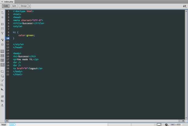 Crear un nuevo archivo php (no html) llamado index.php. Hacer un h1 verde que dice: "Éxito" y un enlace que une a # diciendo, "Cerrar sesión".