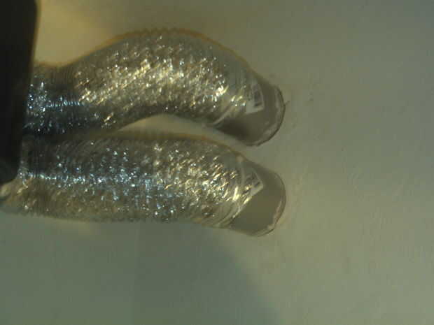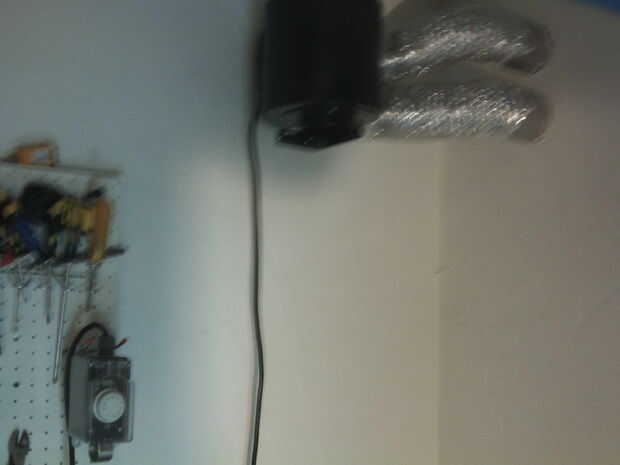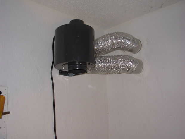 Estoy usando un Soplador Ecoplus para extraer el aire caliente hacia el exterior. Es controlada por un termostato adicional del de Kkontrols. Había montado el ventilador en la pared con este adaptador. Sirve como un soporte de montaje y permite conectar dos mangueras secador de 4" de ventilación. He conectado las dos mangueras secador a dos respiraderos del secador a través de la pared. Tengo una pared de marco así que fue fácil. Todo esto se monta arriba para recoger el aire caliente resucitado.
