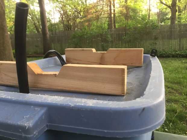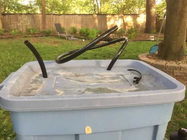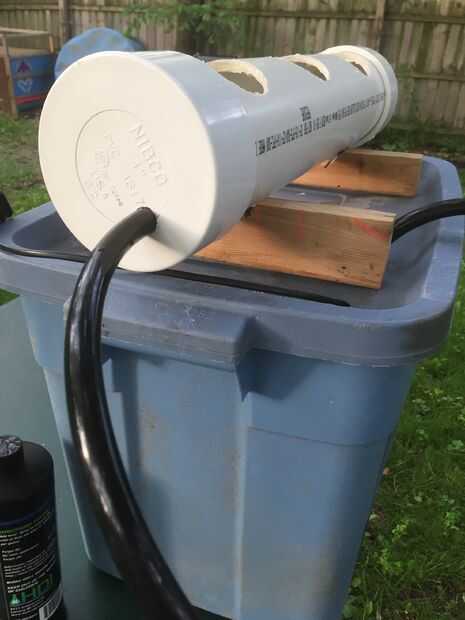 Primer lugar palo el 4'6 "tubo en el orificio más cercano al orificio para la salida. Ponemos el tubo de 10" en el orificio del extremo. A continuación, ponga la bomba sumergible sobre el fondo del depósito y conectar a la pieza más larga de la tubería para que se sienta en la parte inferior de la bandeja de. Ejecutar la toma de corriente a través del orificio de 1" y a conectarlo una vez su listo para. A continuación colocar la pieza más hundida de madera cerca del extremo del lado con solamente un agujero y luego coloque el otro trozo directamente opuesto (la idea es que cuestas hacia abajo con el agujero para drenaje). Después de eso, puede añadir el canal. Necesita conectarse a 10" Tina en el agujero en la parte inferior del PVC y poner el tubo más largo en la tapa del extremo del PVC. Asegúrese de que la altura del tubo interior del canal es a la misma altura que la parte inferior de las macetas cuando descansan en los agujeros (esto es para asegurar que el nivel del agua apenas toca las raíces para no ahogarse). Ahora está listo para añadir la mezcla de nutrientes y agua en el depósito y encender todo. Añadí unos 5 galones de agua y por consiguiente ha añadido los nutrientes (suele haber instrucciones sobre cuánto compra debe agregar por cada galón de agua, por lo que busque en el paquete del alimento mezcla de nutrientes). Asegúrese de que se mezclan y su listo para encender la bomba. Ahora puede Agregar el germinado de semillas en las macetas también con el medio inerte de su elección. Una vez que todo está configurado, usted puede poner en la luz crece sobre las plantas. Asegúrese de que está lo suficientemente lejos para no quemar las plantas, pero lo suficientemente cerca para las plantas realizar fotosíntesis.