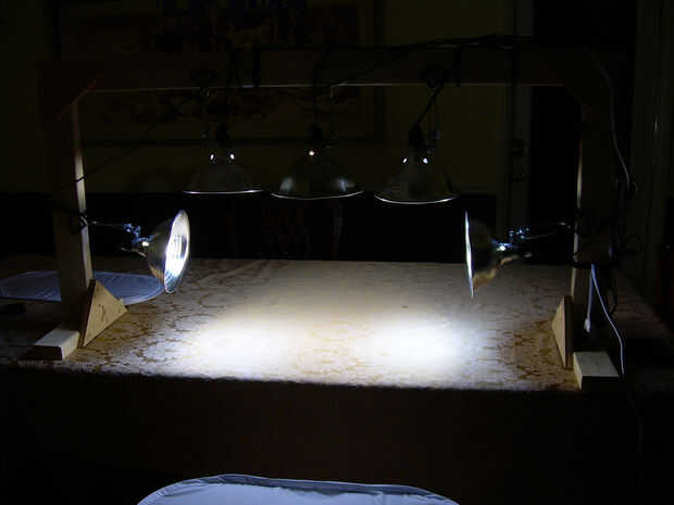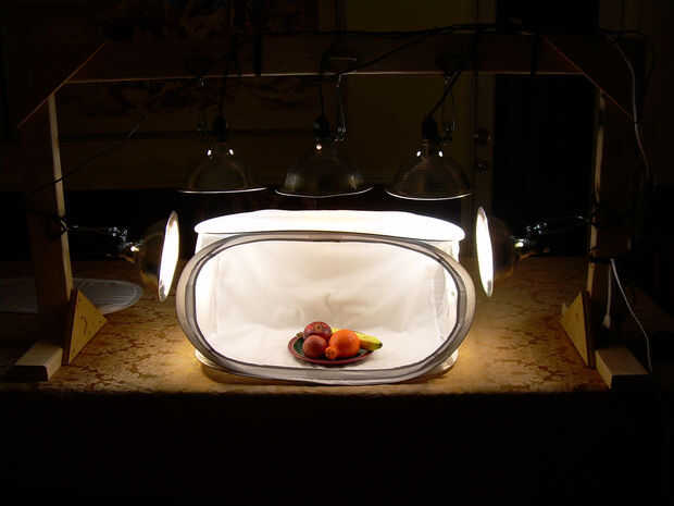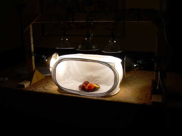 Cada uno de los pasos siguientes muestra el mismo plato de fruta bajo una configuración diferente de las luces. Las luces cinco abrazadera están siempre en y la cámara siempre se sostiene en un trípode, para evitar que se mueve, mientras que el ciclo de las luces de trabajo halógenas y cámara flash encendido y apagado. La cámara estaba en modo automático y lo único que ajusté era si me permite el flash o no. Si no usas un verdadero trípode, ajustar tu cámara para retraso del obturador, presione el botón disparador y sacar las manos para lograr imágenes libres de ondulación.