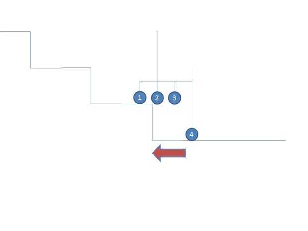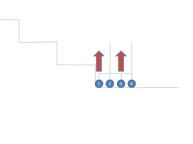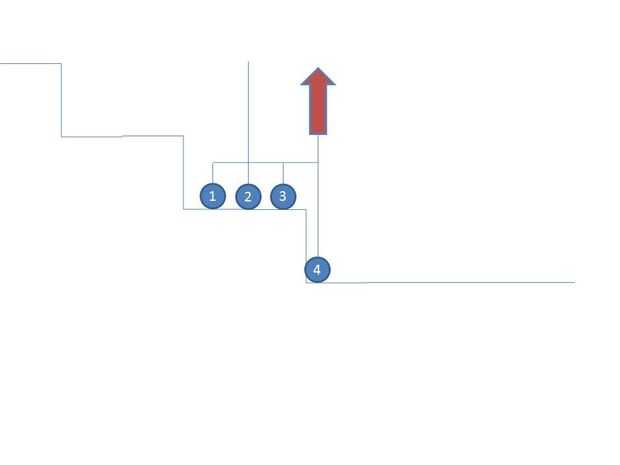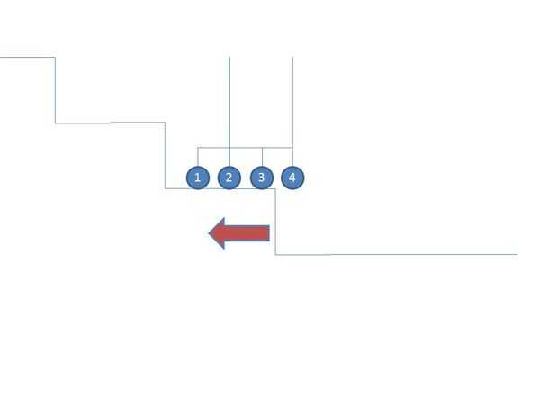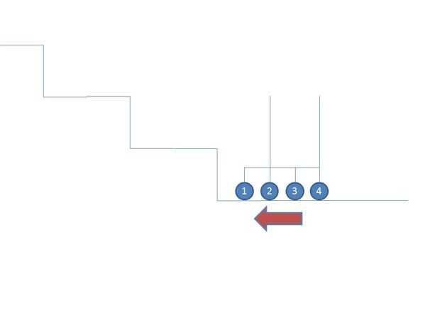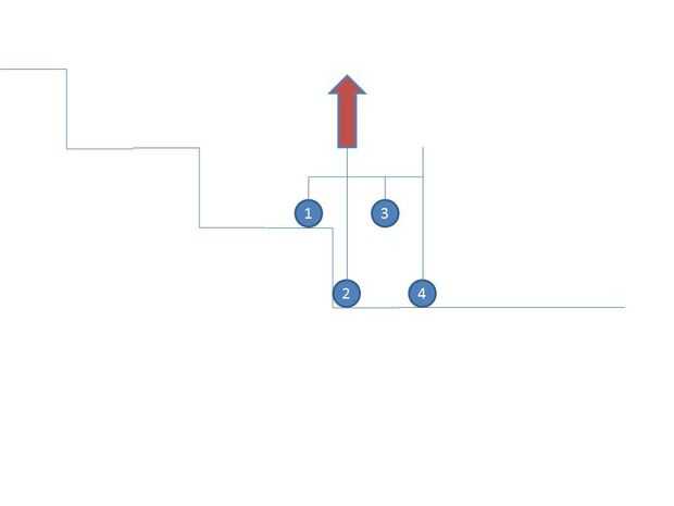 Como se muestra en la imagen, el seguidor de línea en la rueda 2 ha detectado obstáculos (las escaleras), tan capuchón 1 levantará la rueda 2 hasta la escalera más próxima.