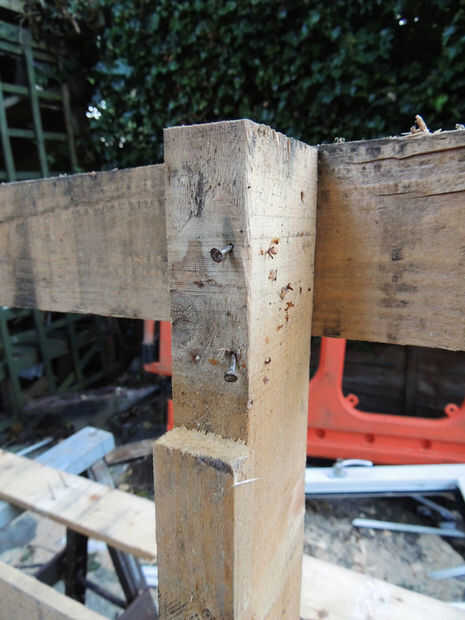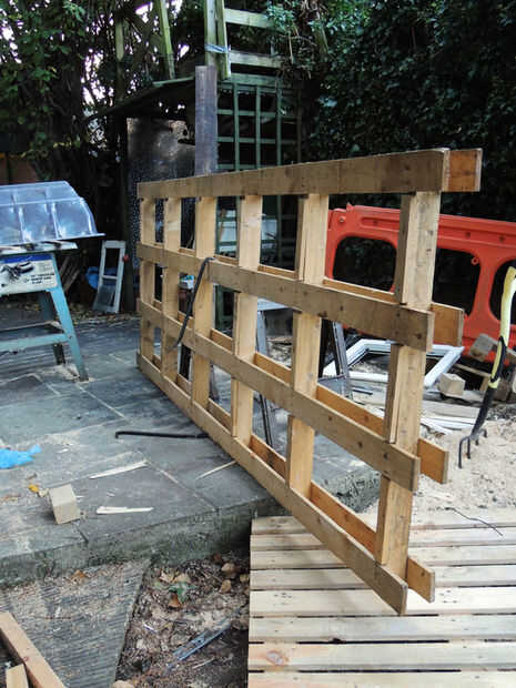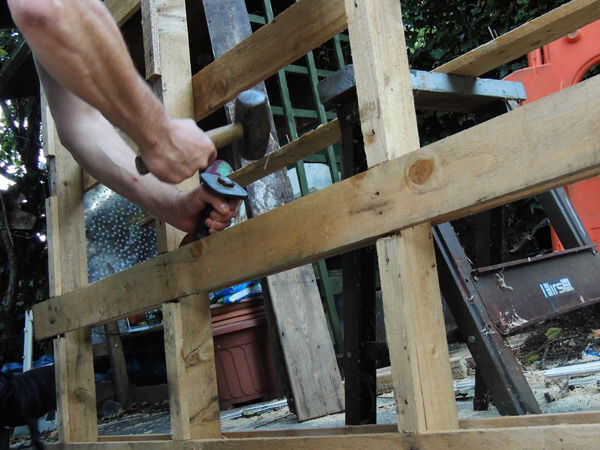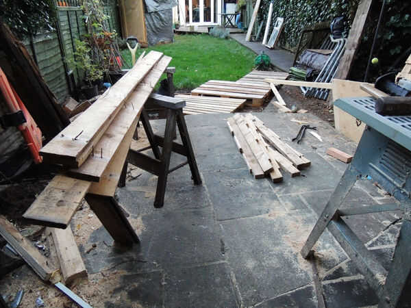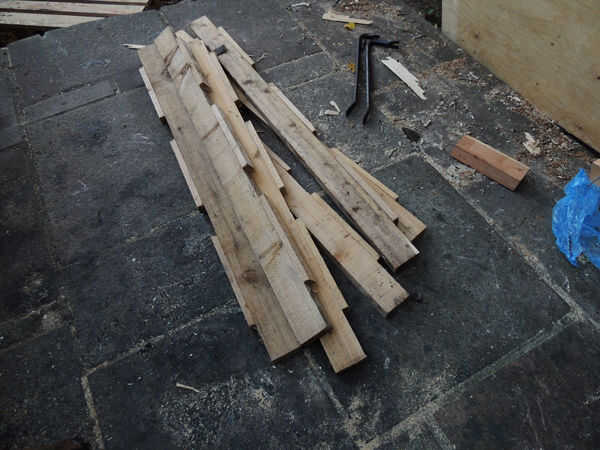 Plataformas, ah paletas. Éstos son como el pan y la mantequilla de madera recuperada. Son tan comunes que apenas necesitará almacenar para arriba. Si usted necesita alguna madera, usted puede encontrar por todo el lugar. Hay dos tipos comunes. La mayoría son palets de tamaño estándar que miden cerca de 1200 mm x 1000 m m (4' x 3' 3") pero también hay un tipo más de largo, usado para tablero de yeso. Son 2400mm 1200 mm generalmente (8' x 4') con tablones generalmente sobre 100mm de ancho (4") y éstos son grandes para hacer el revestimiento.