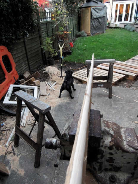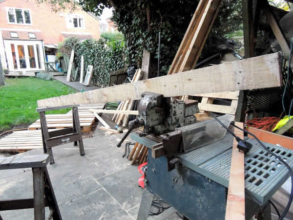 Aquí está una tabla de la plataforma en un vicio. Tenga en cuenta el caballo apoyando el otro extremo.