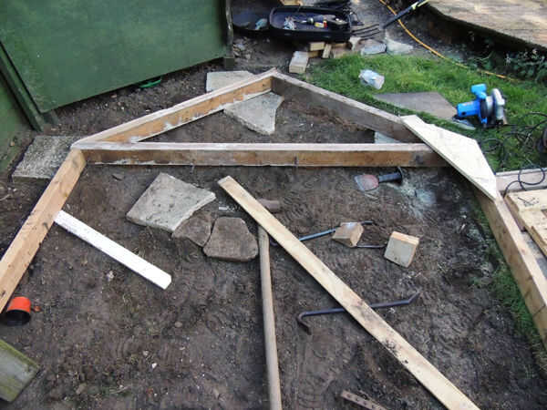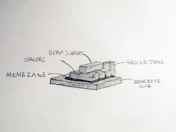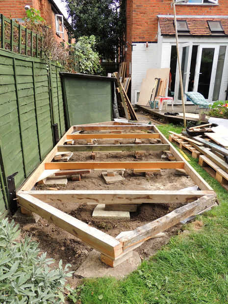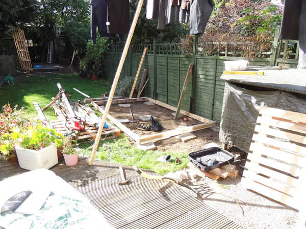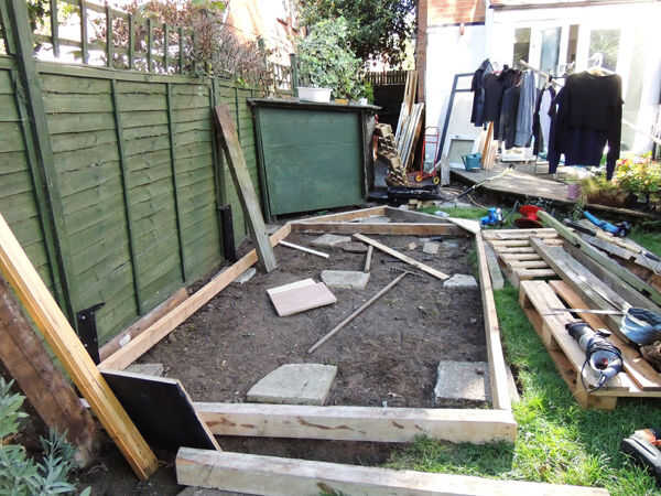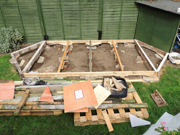 Como todos los buenos edificios, la primera cosa a hacer es crear una buena base sólida. Para ello, he construido un simple piso de madera levantado de baulks de madera de sección 100 x 50 mm (4 "x 2"). Estas piezas eran cualquier varios recortes que pude reunir. Éstos incluyeron algunos calidad cepillada rieles de madera de viejos marcos de cama de madera, algunos rieles de esgrima antigua y algunas viejas canilleras de la puerta (los postes verticales en un marco de puerta).