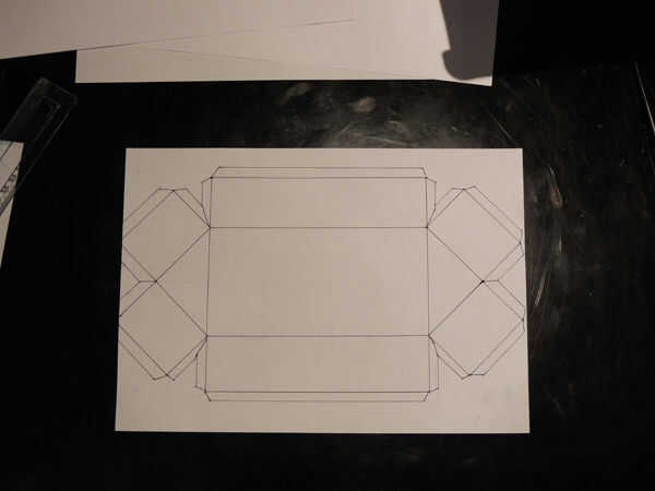 La huella del summerhouse es un hexágono alargado. Es más fácil ver que describe. Esta es la base, como sacado de uno de los modelos de papel de prototipo. (no a escala o dimensiones exactas).
