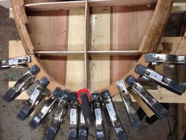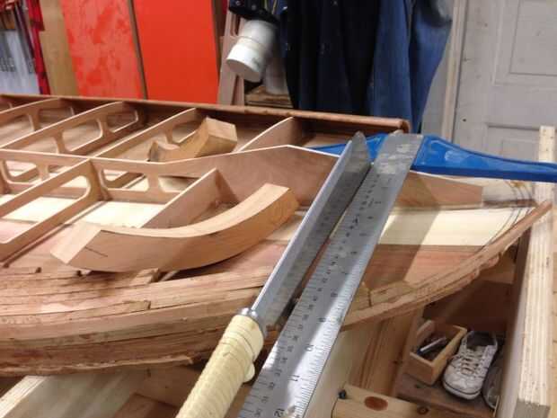 Con los rieles bead & Cala completados es hora de cortar las secciones de nariz y cola de bloqueo sólido. El bloqueo sólido le ahorra de tener que curvas de radio cerrado de la curva de vapor y se añade transiciones ascéticamente agradables en la nariz y la cola. Bloqueo también se agrega la caja de aleta, manija SUP, Copa correa y ventilar antes de añade el panel superior. El bloqueo interno es posible de espuma reciclada (en la foto) o bloques de madera sólidas.