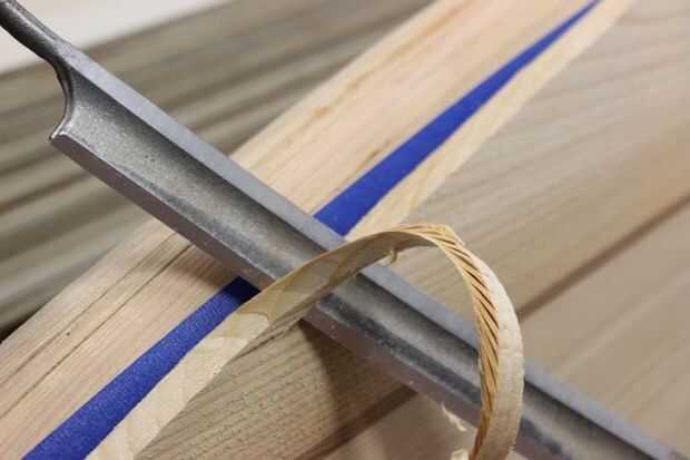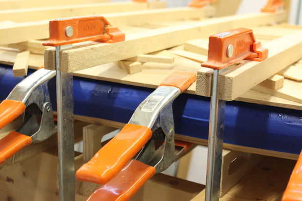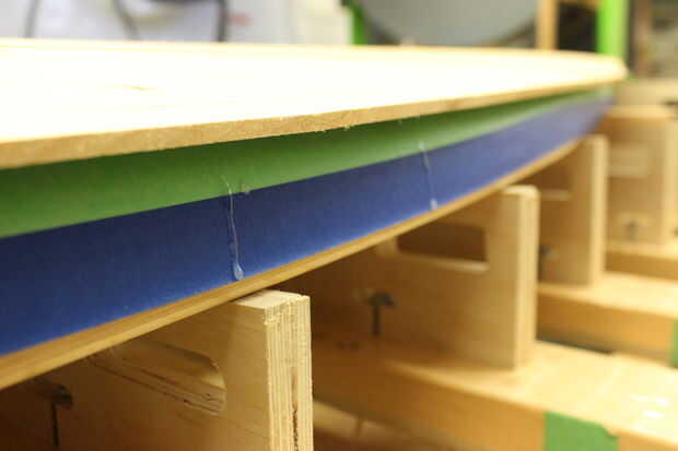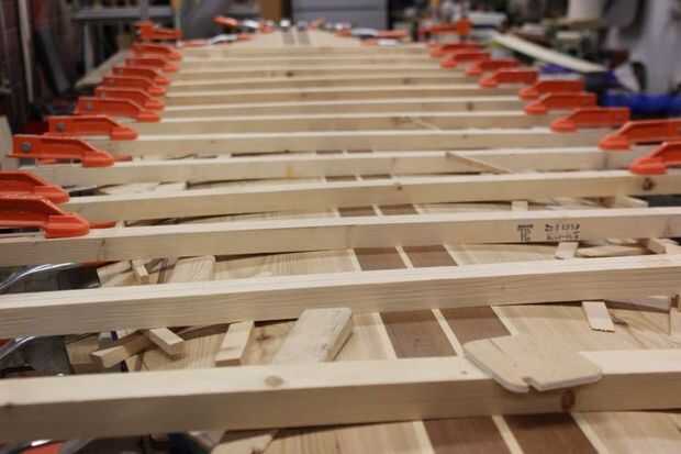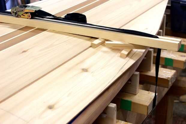 El siguiente paso en la construcción de una SUP de madera hueco es fijar el panel superior. Como un constructor profesional, tengo un montón de pinzas pero no necesita paredes de pinzas para hacer este paso. Las pinzas en la foto se utilizan para sostener fuerte espalda en posición pero cintas o cadena también puede ser usada. Cuñas de madera de la puerta no la verdadera sujeción y permitan curva la cubierta presionando contra la fuerte espalda. Después se une la parte superior se retira el material sobrante con un drawknife y spokeshave y los rieles se dan un modelado final.