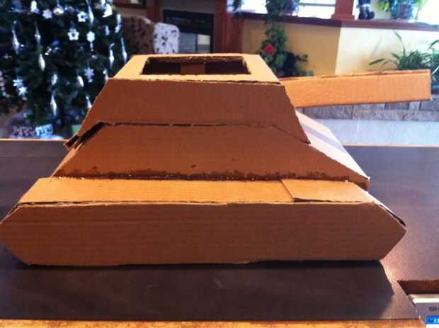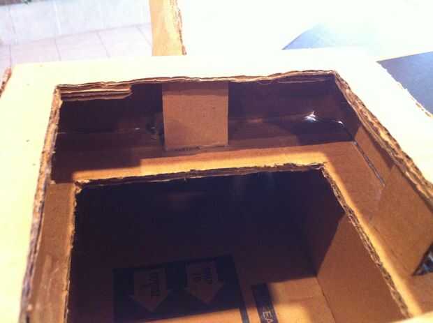 Utilizando simplemente una caja de cartón, cartulina, pintura en aerosol blanco barata, brillo negro y plata tarjeta stock de papel, un sombrero de fiesta plata holograma, un tapón de jabón de lavandería, una pistola de pegamento y algunos artículos