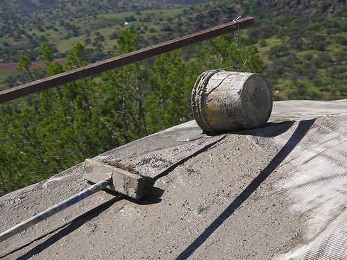 1. Con pinceles grandes de asas largas, pintar el techo todo con una capa de acrílico, cemento y agua. Desea que la consistencia sea como crema agria. Se cubre completamente todas las partes de la malla.