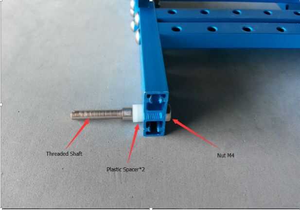 Trabe el eje roscado y 2 espaciadores de plástico en los orificios en el extremo del chasis, como se muestra en la figura.