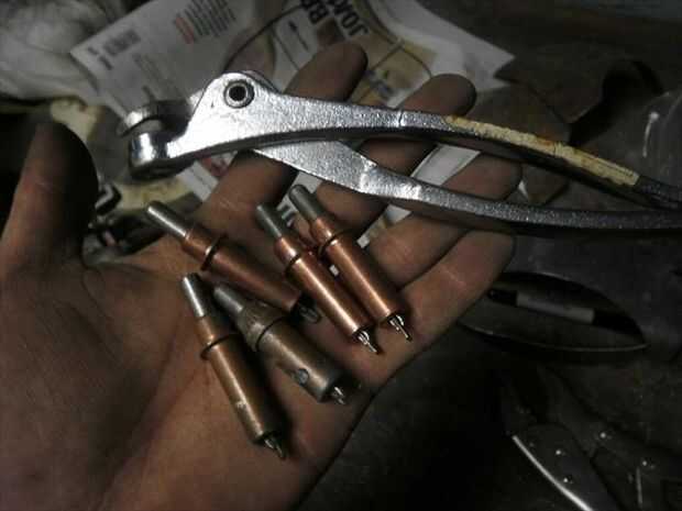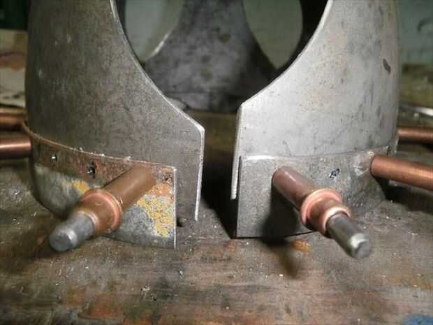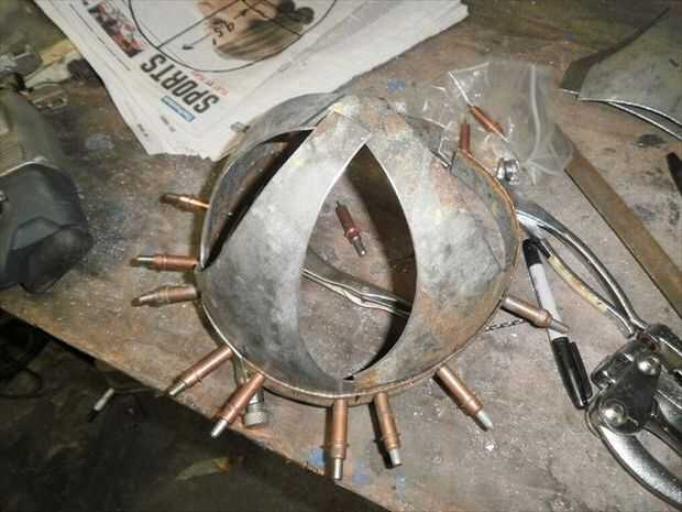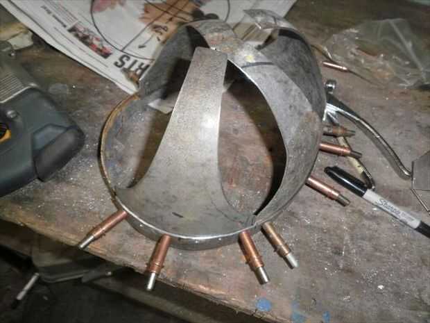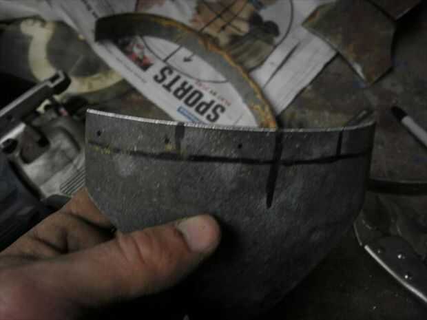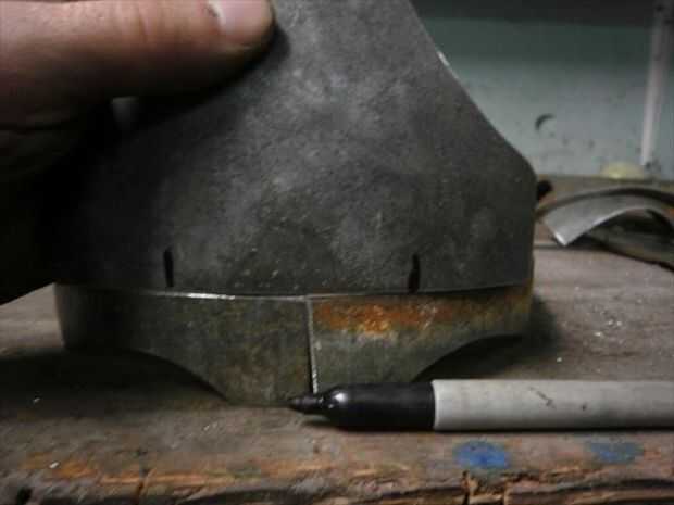 Una vez que tenga la pinza derecha ajuste todo en su lugar y marca donde irá remaches. Entonces sacador de centro y taladro el remache agujeros en la banda de la frente. Una vez que los agujeros se perforan darles un rápido una vez con medio lima redonda y utilizarlos para sus partidos en la banda de spangen de la marca. Sacador de centro y taladre los agujeros, luego utilizar Clecos o tuercas y tornillos para unir todo.