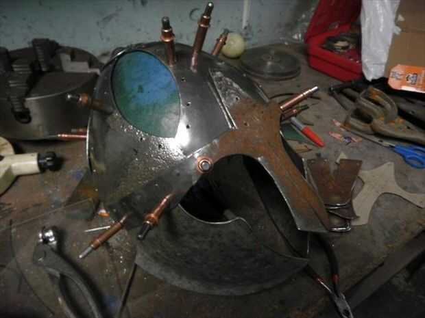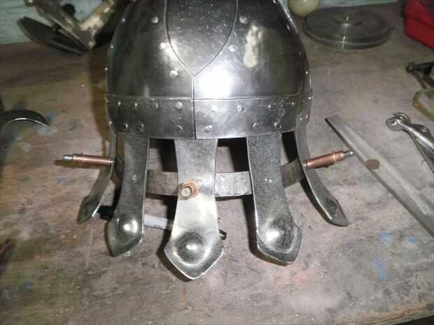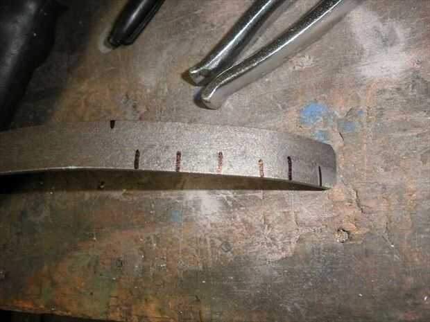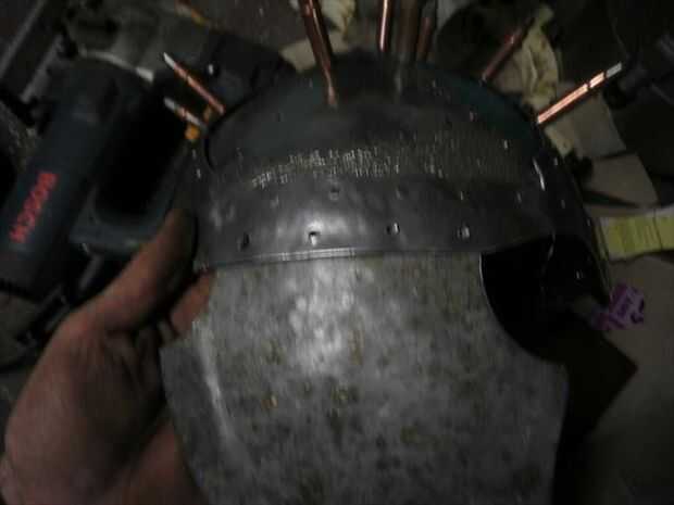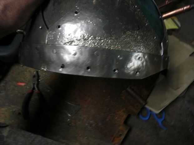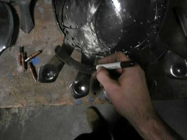 Una vez yo estaba contento con el ajuste marcado los orificios existentes en la banda de la frente, los perforados y mientras que la nasal se llevó a cabo en lugar con clecos he marcado y había perforado los otros agujeros de remache.