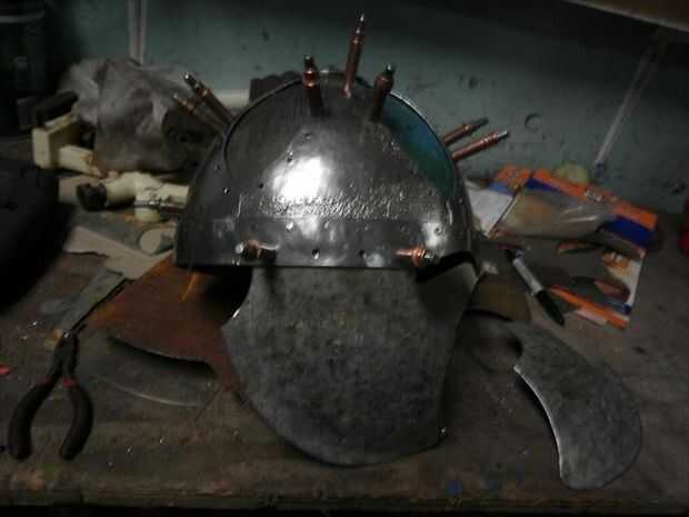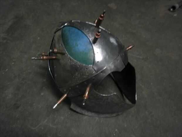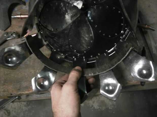 Por último haremos la nasal. Comencé por arrugar la nasal. Hacer que marqué mi centro de línea tan lejos como quería el pliegue para ir, entonces había fijada en el vicio y hammed encima un poco. Es así de simple. A continuación cóncavo parte superior de la nasal un poco en el plato bajo, que lo hace sentarse muy bien contra la parte superior de la cabeza.